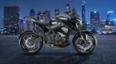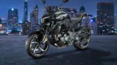 The styling cues include a sharp-looking headlight, muscular fuel tank, step-up seat, twin-barrel exhaust, and rear hugger-mounted numberplate and turn indicators. The sharp and chiselled design of the motorcycle is complemented by modern features such as keyless control, a tyre pressure monitoring system, a five-inch LCD, and full-LED lighting.